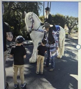 Shire Stallion Finn waiting for his turn to march at the 2025 Laguna Beach Patriots Day Parade